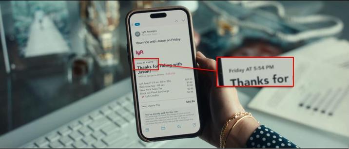 In "The Better Sister" (2025) s01e02, the main character gets a Lyft email receipt for a ride that just ended, and the receipt shows the ride time as 5:54 PM. However, the scene is set in the morning.