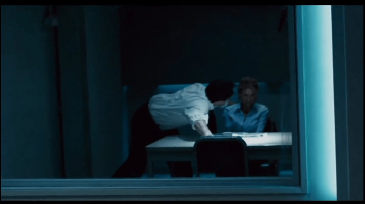 In Saw IV, in Jill Tuck's interrogation scene you can see a mic at the top right in the mirror.