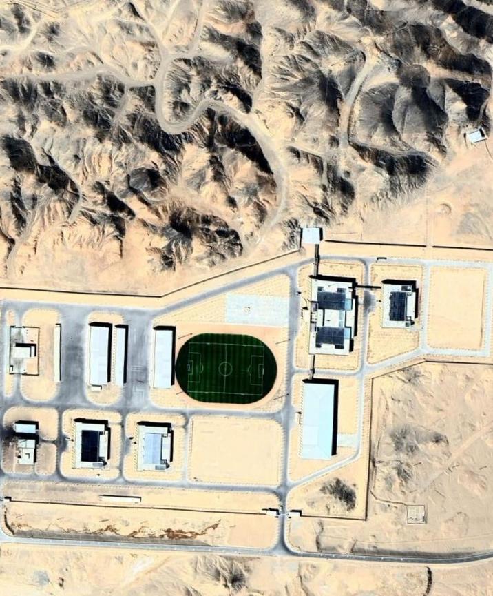Buildings near white sands with a circular fence around them with a large HVAC unit sticking from the ground. Anyone know what they could be used for?