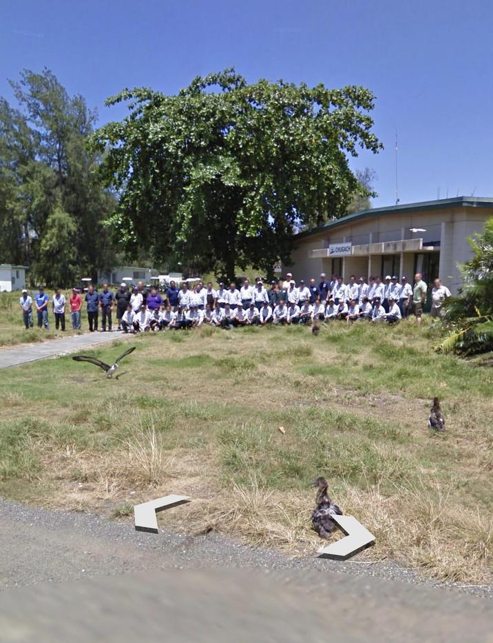 The staff of the medical clinic on Midway Atoll pose with a bird that looks unhappy being photographed