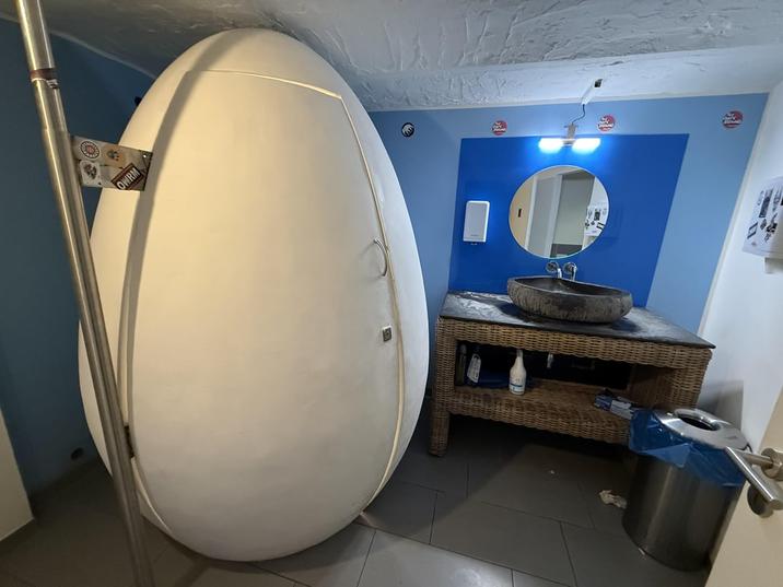 Restaurant toilet cubicle is an egg