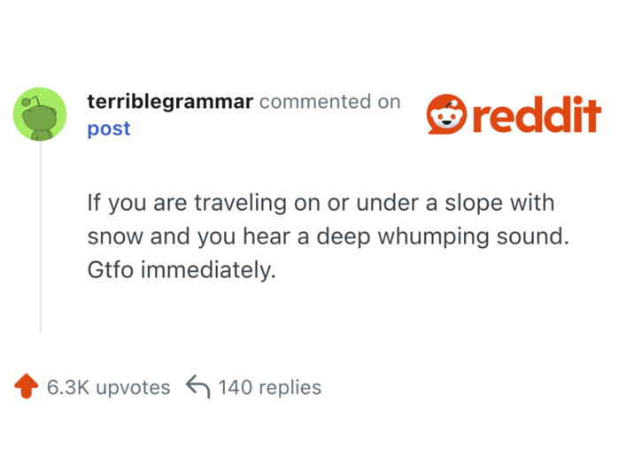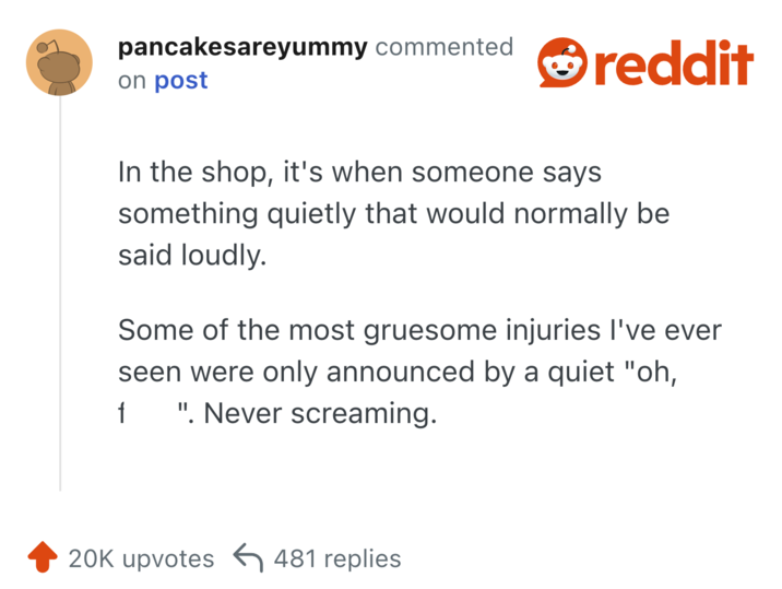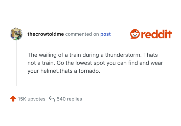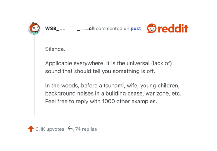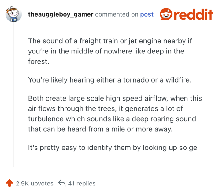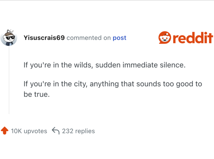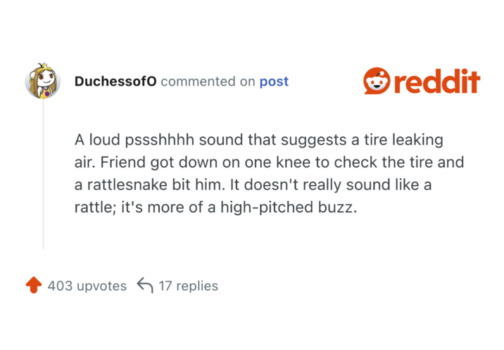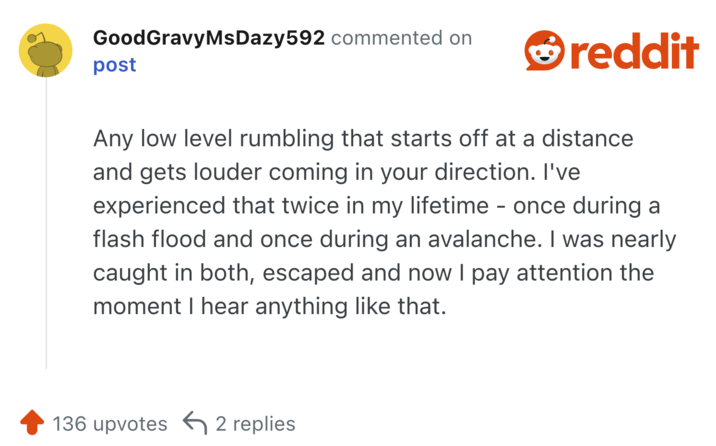 Someone on Reddit asked users what is a sound that people should recognize as immediate danger, and people had answers. Some of these are obvious things that everyone should know, but might not put a lot of weight on. Others are more distinct knowledge that only someone with experience might know.