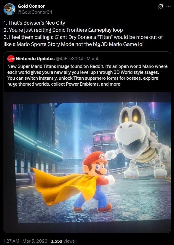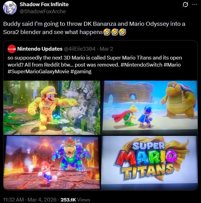 Purported screenshots of Super Mario Titans, which is rumored to be in development by Nintendo, were first posted on the /r/SuperMarioOdyssey subreddit at the beginning of March 2026. That post was deleted, but was archived and quickly reposted by X / Twitter user @4iiEiie3304.