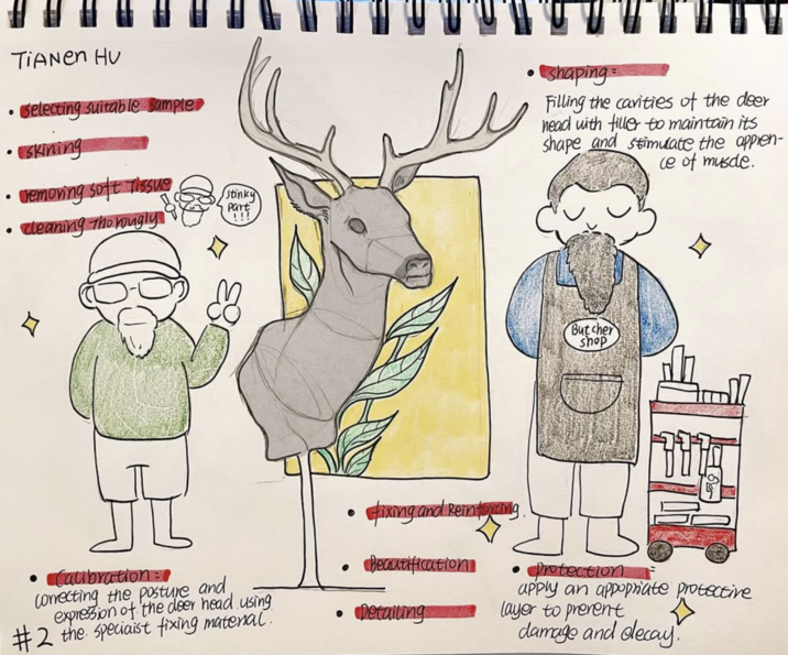 Here's a photo of Testa and his colleague Rudi prepping to mount a Giraffe, and a little anime-style sketch a touring University of California, Santa Barbara (UCSB) student made of his workspace in 2024.